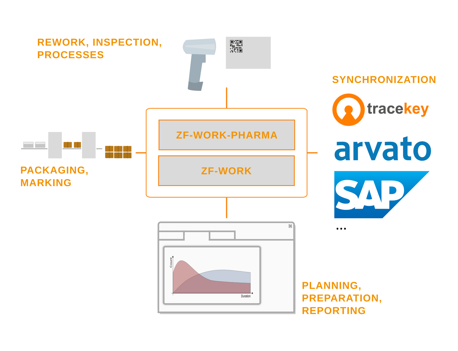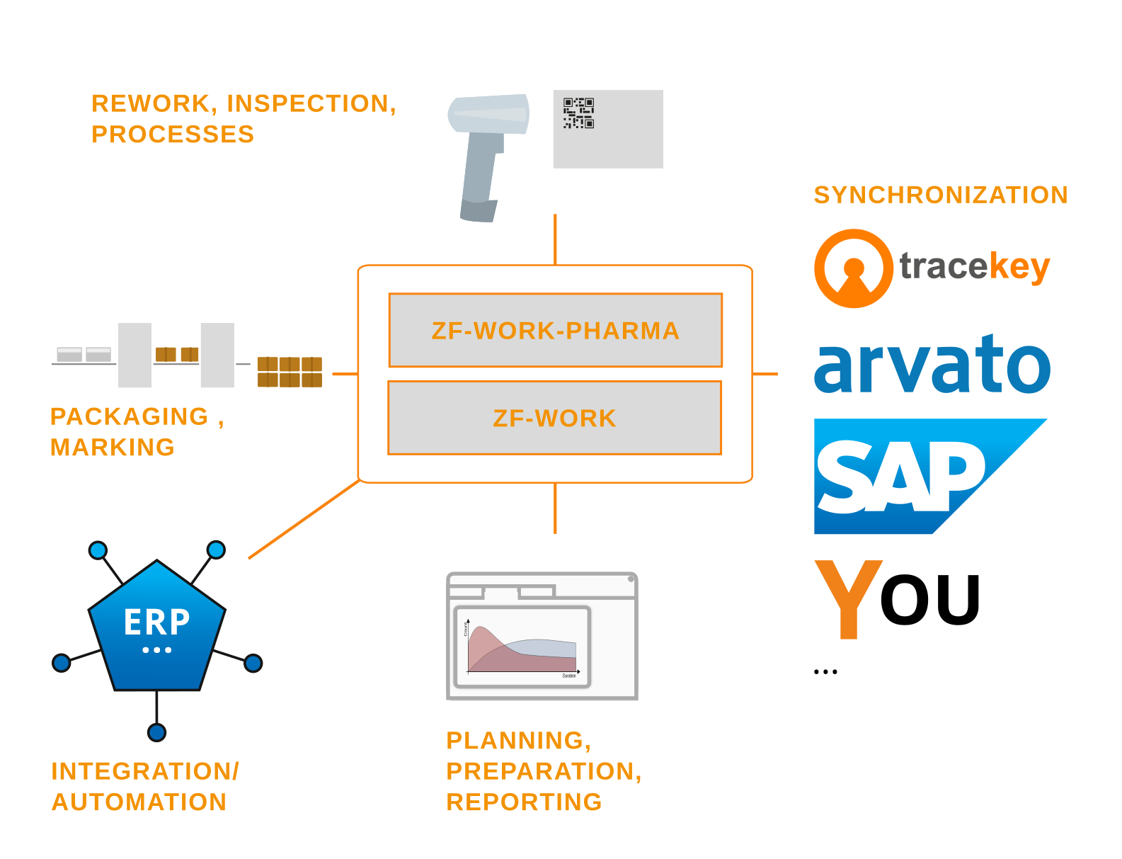 The zf-work-pharma product offers a cost-effective level 3 track-and-trace solution for pharmaceutical serialization in production. zf-work-pharma, which was developed in collaboration with tracekey solutions GmbH, perfectly complements the serialization process.