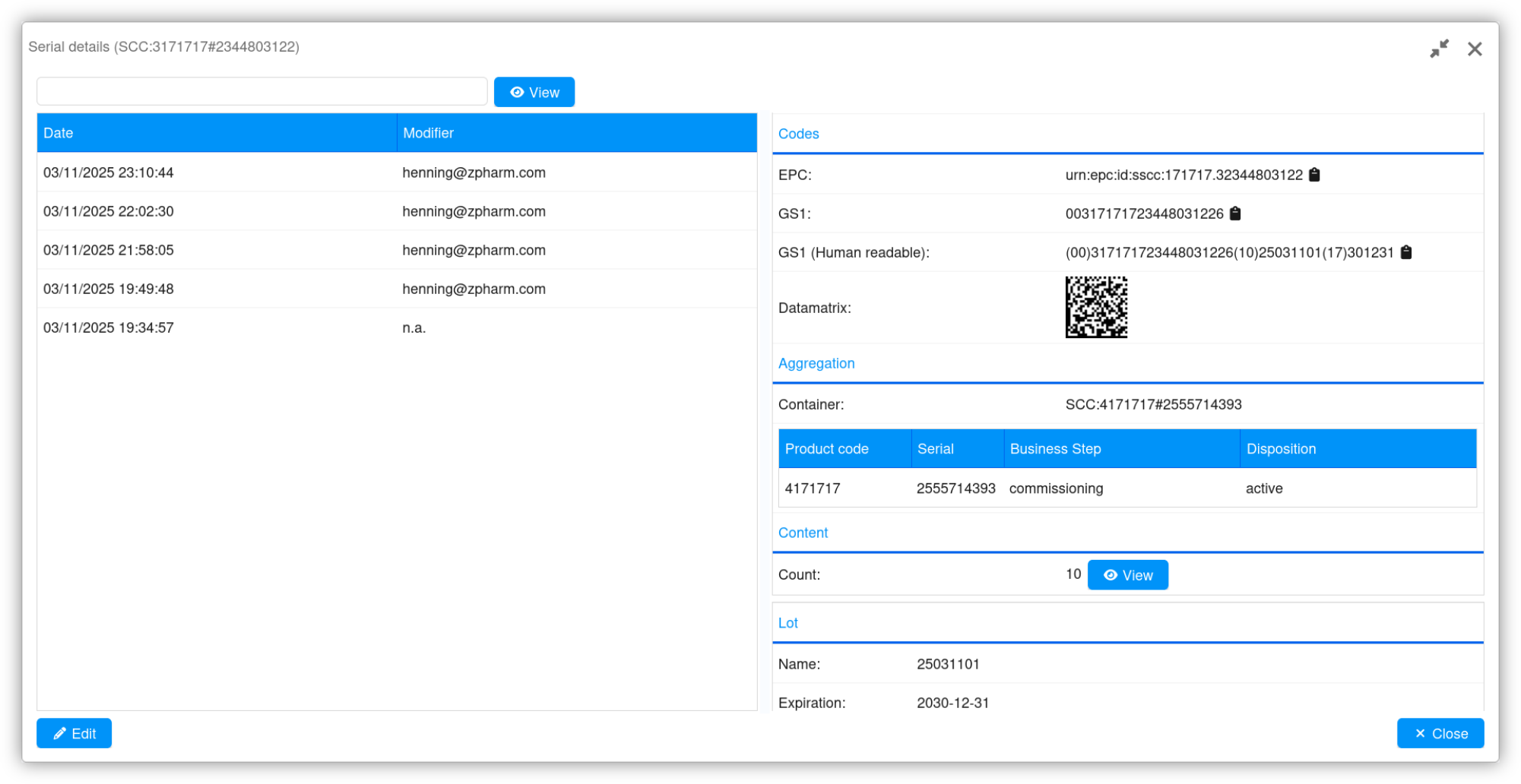 Zf-work-pharma is based on a genuine track & trace core and can not only generate batch reports, but also record genuine delta reporting, including aggregation changes.